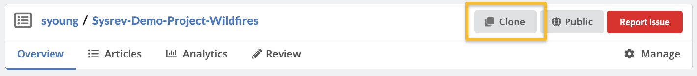 Copies of public Sysrev projects can be easily created using the Clone or Child Project features. These tools let you build on existing reviews by reusing or refining their content.