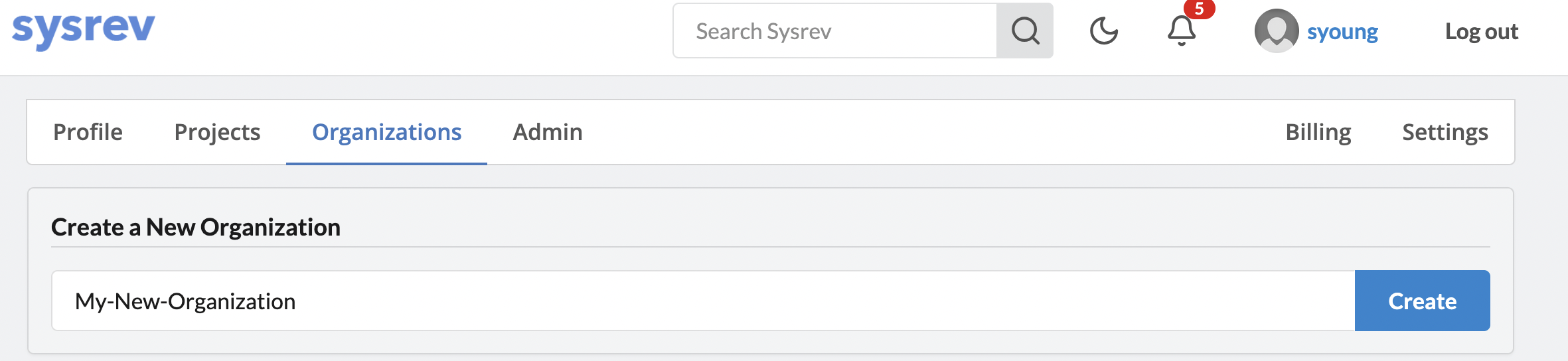 Sysrev Organizations offer another level of project management and organization. To create a new Organization under your main user account, go to your Sysrev account page by clicking on your username in the upper right hand corner. Then click on the Organization tab. Enter an name in the Organization Name field and click Create. Note that Organization names may only contain letters, numbers, and hyphens.