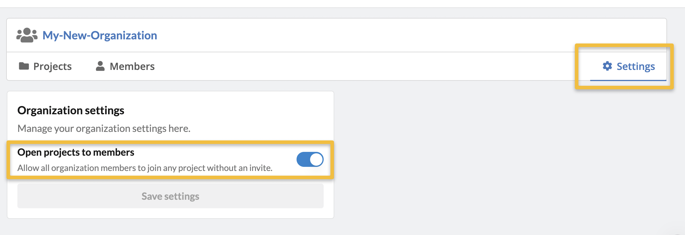 You can now create new projects and manage members within the Organization. You can also allow any member of the Organization to join any project within the Organization, or turn that option off, such that Organization members can only join a project if invited by the project admin or owner.