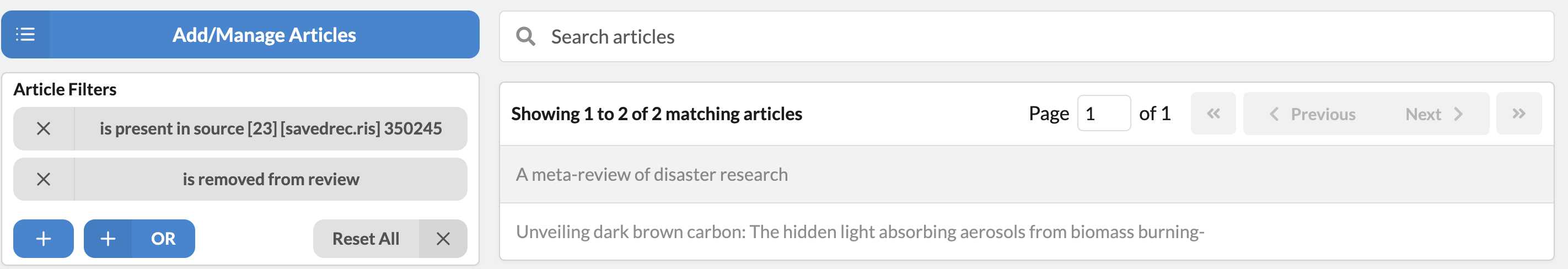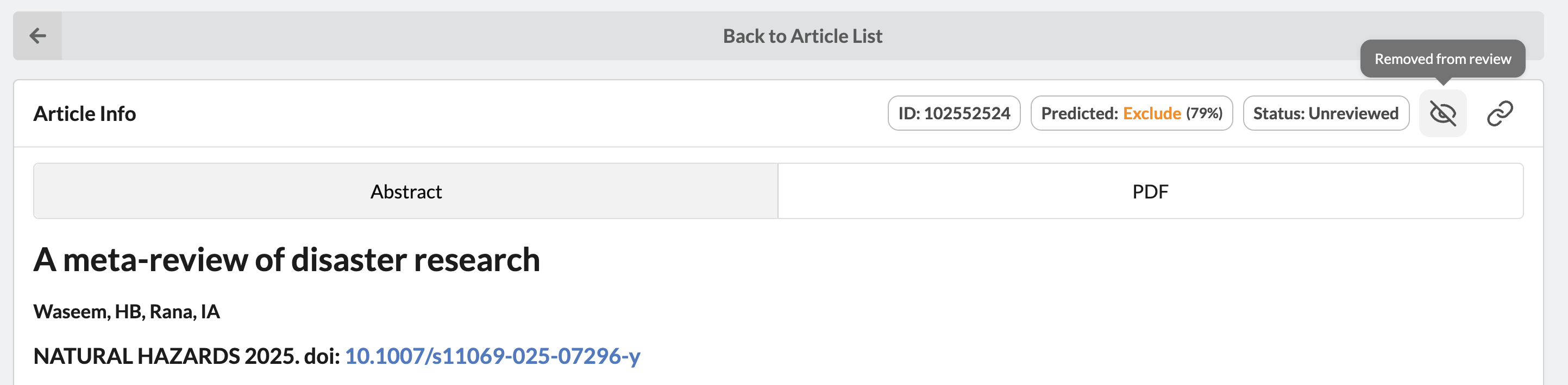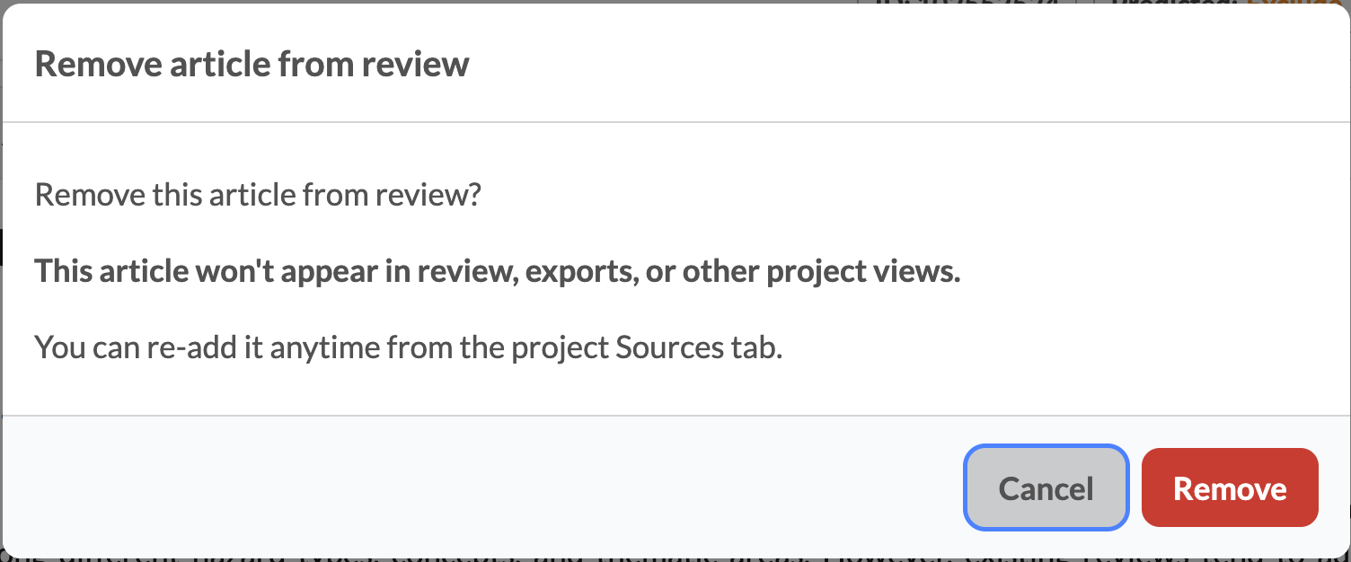 Article Removal: Project admins are now able to remove individual articles, and their data, from the Review pipeline, data visualizations, and exports. Articles can be un-removed (Activated) by Project Admins at any time.