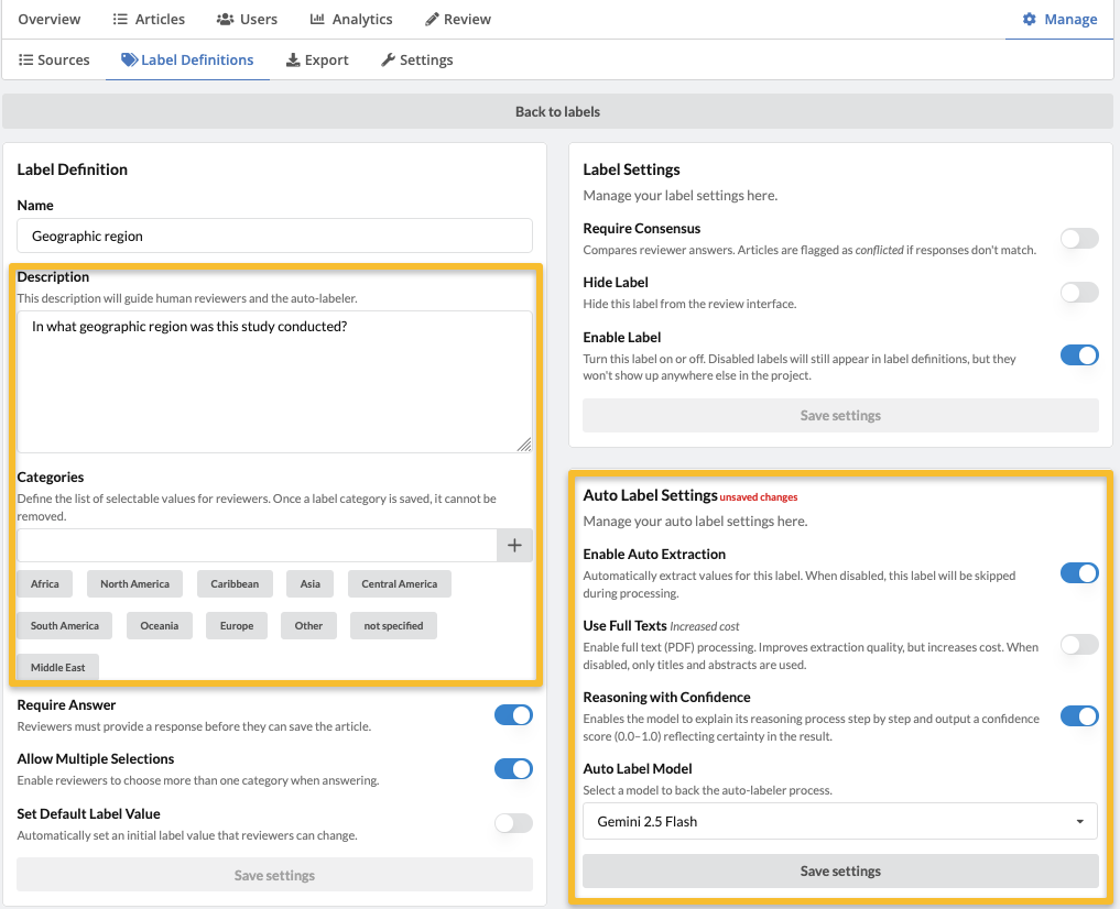 In this example, we have created a categorical label and want the Auto-labeler to answer the question "In what geographic region was this study conducted?", providing the following answers: Africa, North America, Caribbean, Asia, Central America, South America, Oceania, Europe, Middle East, Other, not specified.