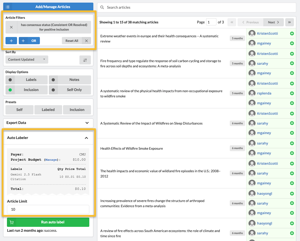 After clicking Save, we can go back to the Articles tab to set the articles that we want to Auto-label. In this example, we filtered for only records that have been included by two reviewers. We set our Max Articles (the number of records we want the Auto-labeler to label) to 10. You can see that the Auto-labeler has provided a breakdown of the cost and estimated the cost of this run to be $0.05