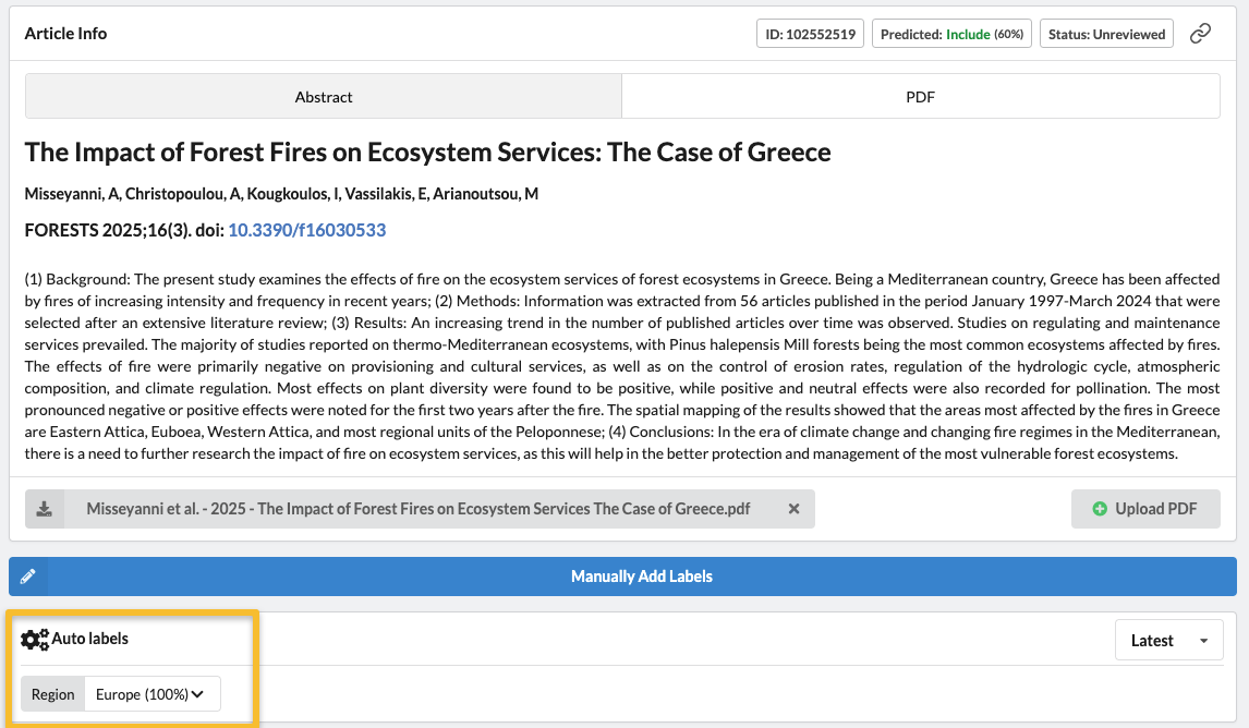 When you are ready, and your selection does not exceed the budget in your account, click the Run Auto-label button. Upon successful completion, the message "Last run just now: success" will appear at the bottom of the Auto-labeler box. To view Auto-label answers, click on one of the labeled articles from the list and scroll down. Below the article abstract you will see the Auto-label answers. In this example, you can see that the Auto-label identified ecological and environmental impacts in this study record. It also included this record with 80% certainty.