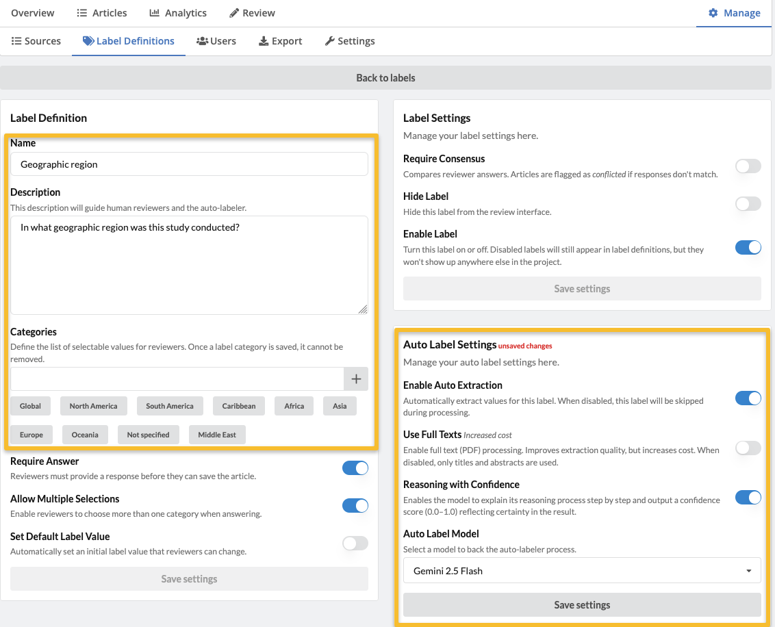 In this example, we have created a categorical label and want the Auto-labeler to answer the question "In what geographic region was this study conducted?", providing the following answers: Africa, North America, Caribbean, Asia, Central America, South America, Oceania, Europe, Middle East, not specified.