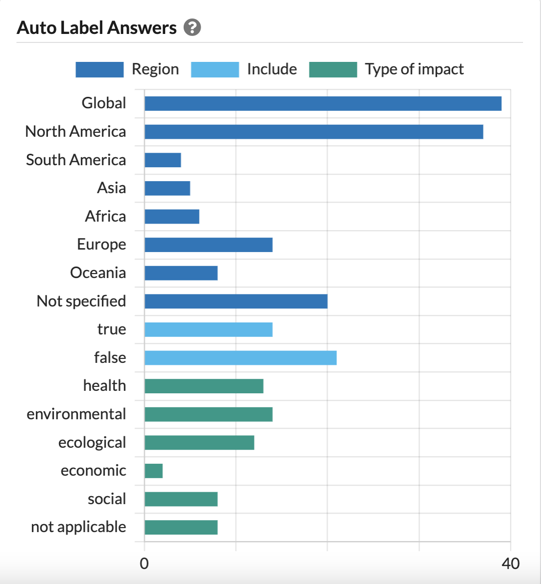 Note: The Auto Label Answers histogram 1) only displays information for Boolean and categorical labels, and 2) only displays counts based on the most recent Auto-label run (query & response) for each label for each article.