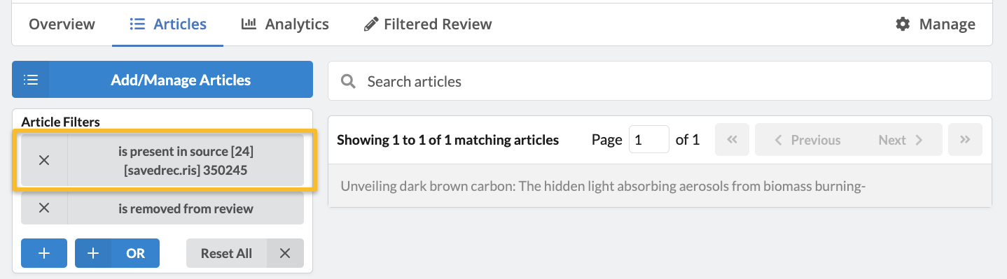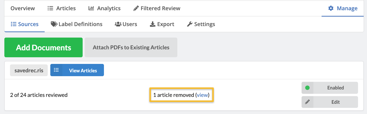 Note that these removed records can be added back at any time, or viewed, reviewed and exported separately. To add an article or articles back, go to the Manage -> Sources tab and find the source containing the removed article(s). Click on View where it indicates the number of removed articles.