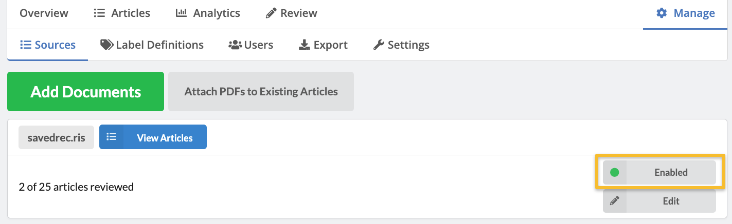 If some action (labeling, reviewing) has already been taken on any documents from a Source and deleting is no longer an option, you can still disable the documents in bulk from that Source. This will effectively remove these records from review, overview page visualizations, exports and the articles list.