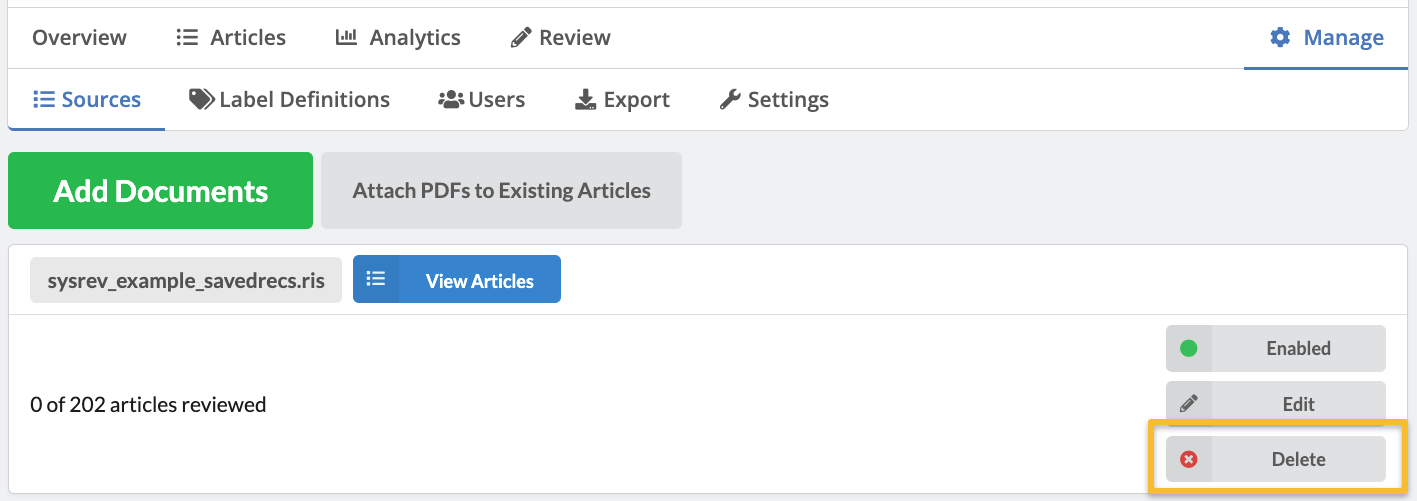There are three ways to manage the removal of documents from a Sysrev project: deleting a document Source, disabling a document Source, or removing individual articles.