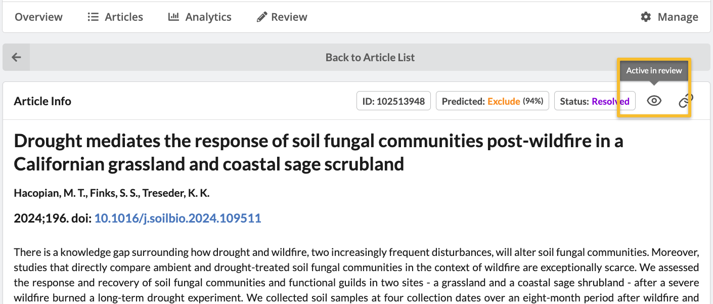 You can also remove individual articles from a review. Like disabling a Source, this will not permanently delete the articles, but rather removes them from the review tab, overview page visualizations, exports and the articles list. To remove an article, click on the article from the Articles tab. Click on the eye icon in the upper right hand corner of the Article Info. Click Remove in the pop-up box.