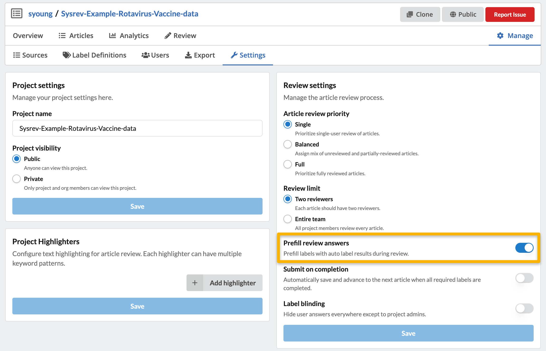 A common way of using the Auto-labeler is with the 'Prefill review answers' setting. When turned on, this setting will cause the Auto-labeler to fill in the label answers for a reviewer to verify, edit, and complete. This helps to speed up the screening and data extraction process by assisting you, the human reviewer, in your task.